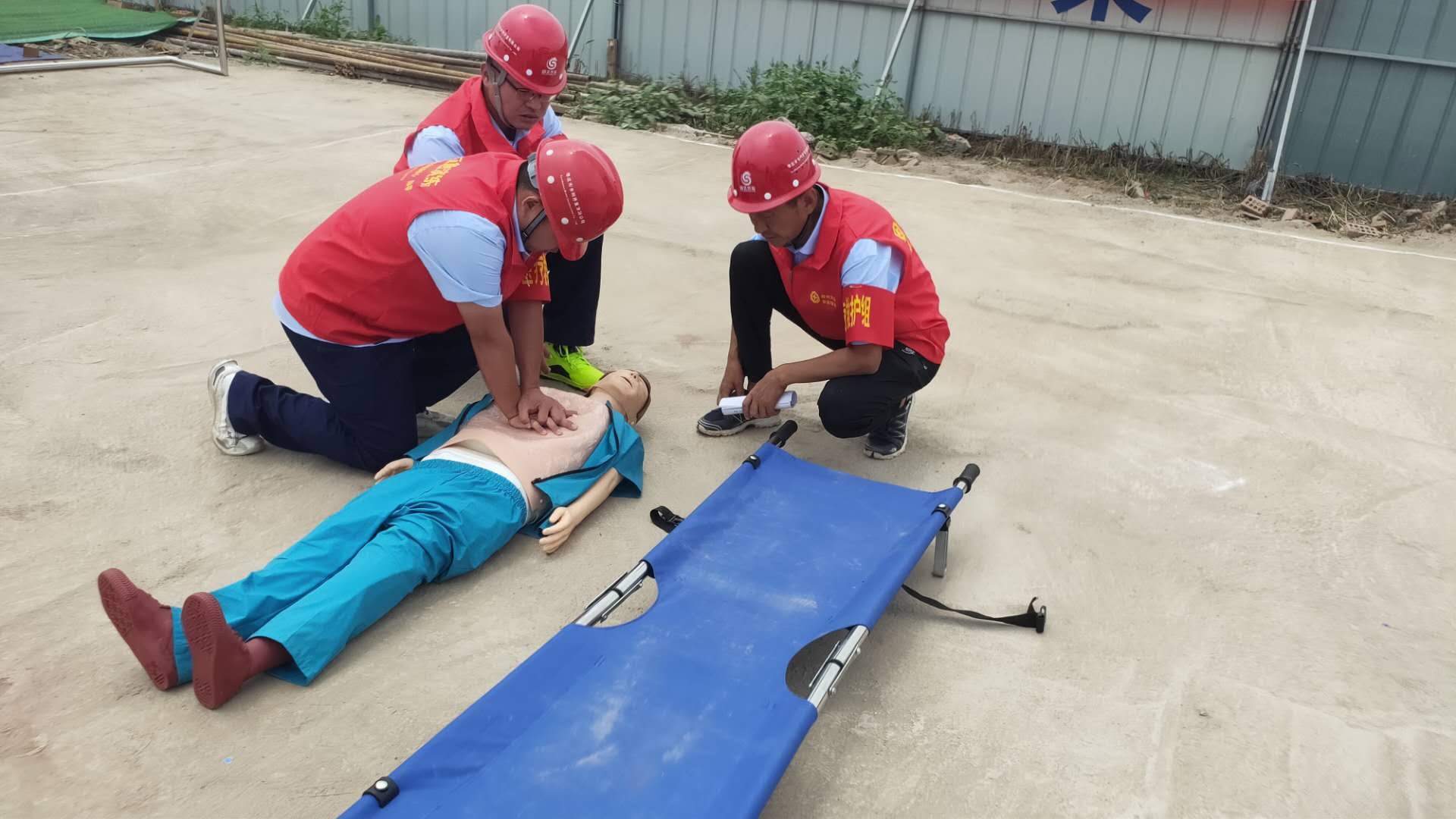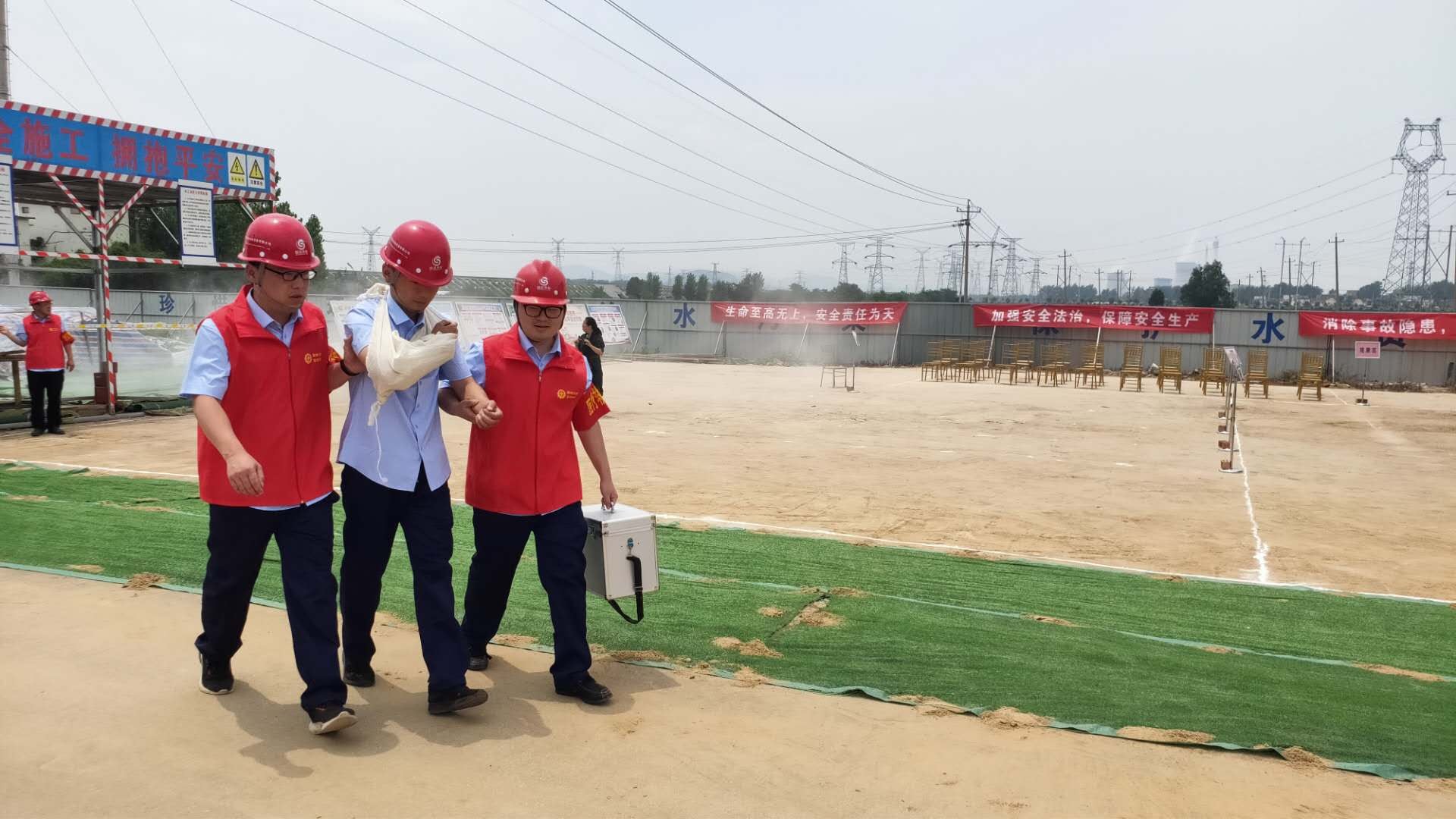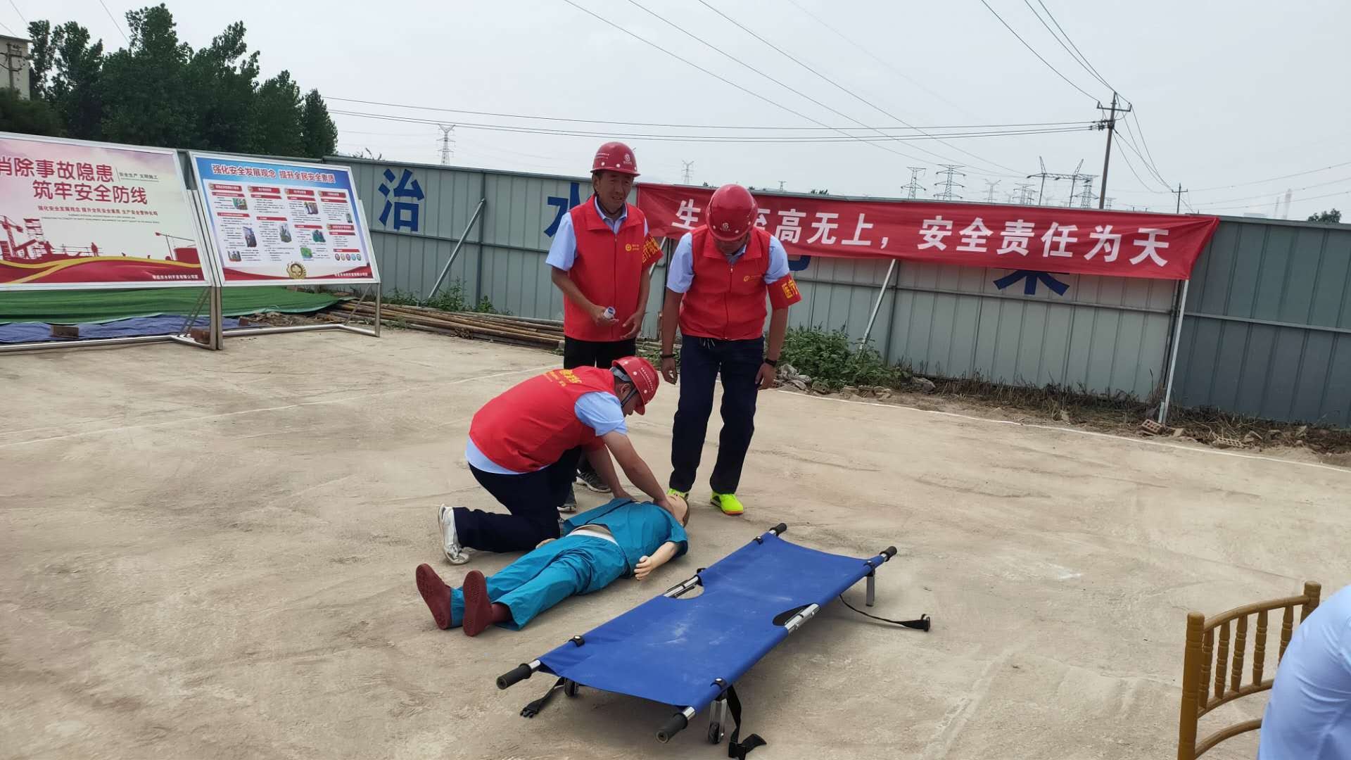 本次演練模擬事故情形為:市中區(qū)東王莊閘除險加固工程施工現(xiàn)場,模板加工廠電線線路短路引發(fā)火災(zāi),員工在實施初級滅火救援中1人不慎觸電,1人在施救時受到機械傷害,公司啟動《棗莊市水利開發(fā)有限公司生產(chǎn)安全事故綜合應(yīng)急預(yù)案》一級響應(yīng)。成立現(xiàn)場指揮部,指揮各救援職能組應(yīng)急救援隊伍進行快速、準確的滅火救援,對傷者進行CPR及止血、包扎、固定、搬運等救護技能操作,在各救援職能組的全力配合下,圓滿完成此次應(yīng)急救援任務(wù)。